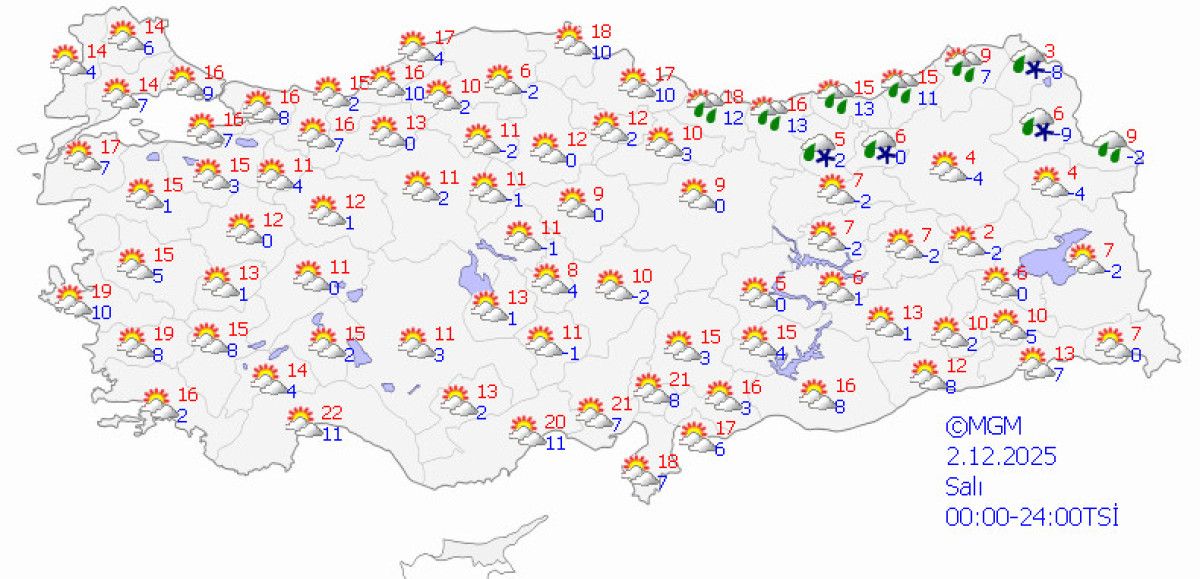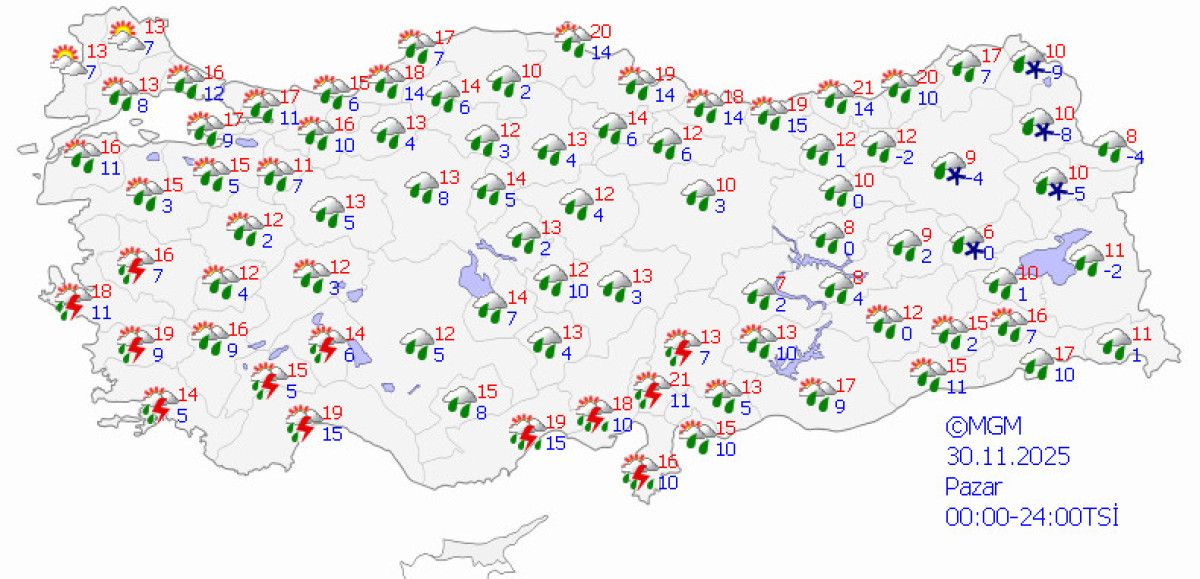 Yağışların Marmara, Ege ve Akdeniz’de gök gürültülü sağanak; İç Anadolu’nun doğusunun yüksekleri, Doğu Karadeniz’in iç kesimlerinin yüksekleri ile Doğu Anadolu’nun kuzey ve doğusunun yükseklerinde karla karışık yağmur ve kar şeklinde; Mersin ve Adana çevreleri ile Hatay kıyılarında yerel kuvvetli olması bekleniyor.